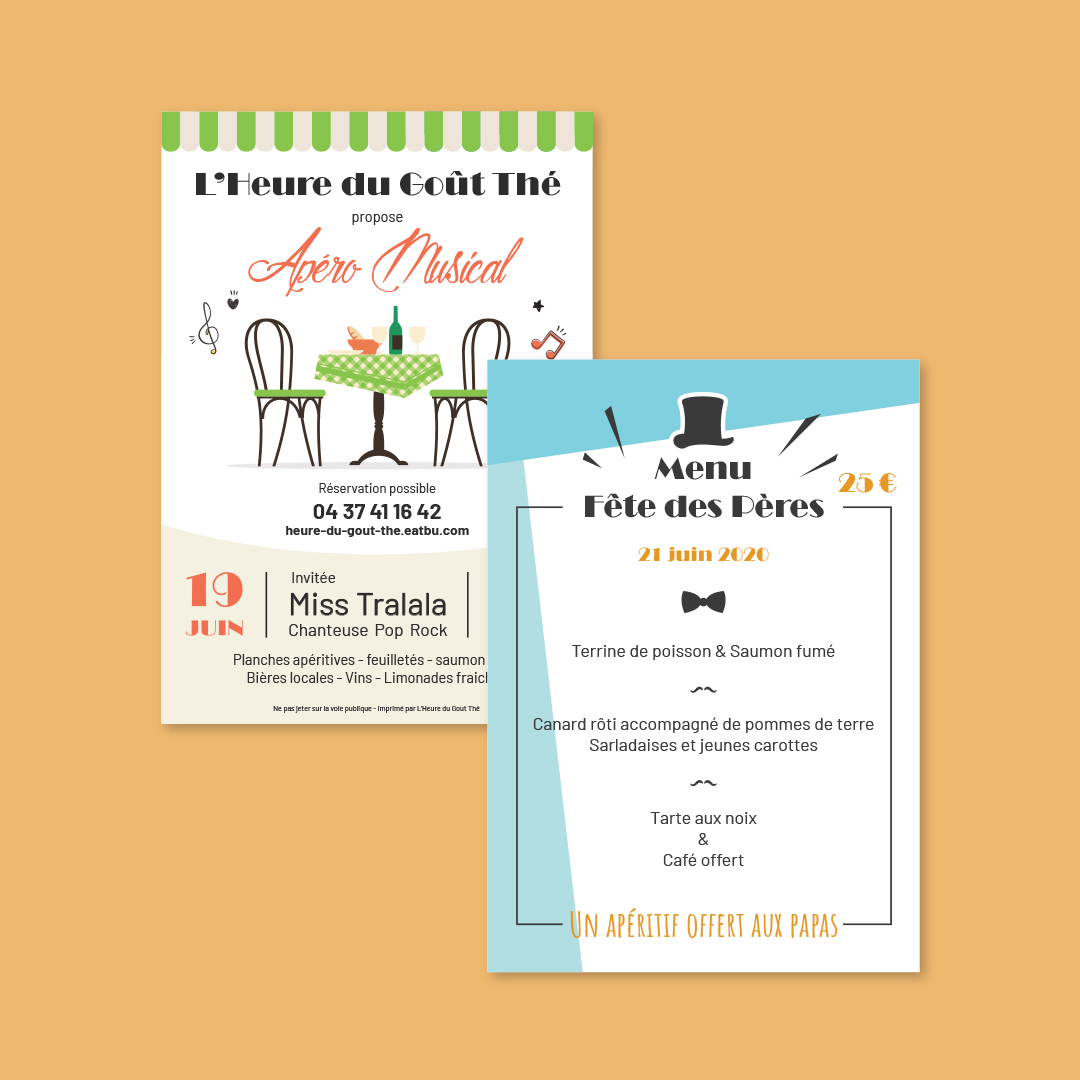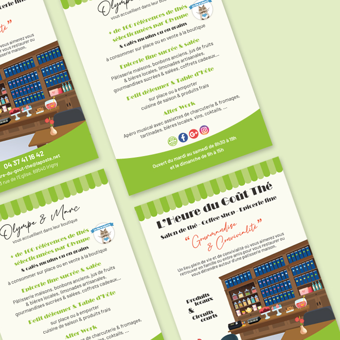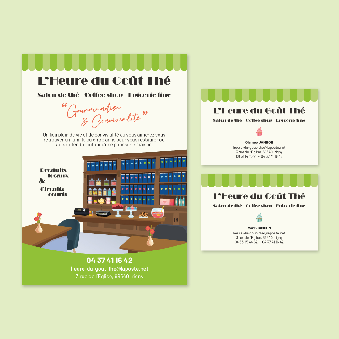 L’Heure du Goût-Thé est un salon de thé, restaurant et boutique de gourmandises. Mon travail pour Olympe et Marc consiste à réaliser l’intégralité des supports de communication et animer les réseaux sociaux. C’est un projet sur le long terme où je vais créer une nouvelle identité visuelle (flyers et cartes de visite), créer les flyers des évènements mensuels et gérer les publications sur les réseaux sociaux.