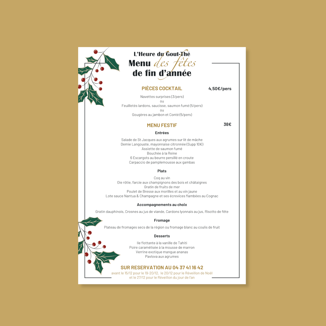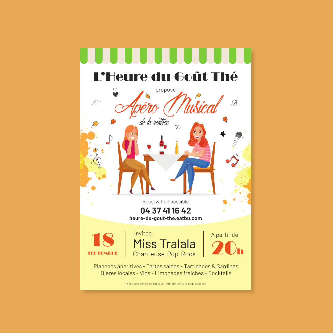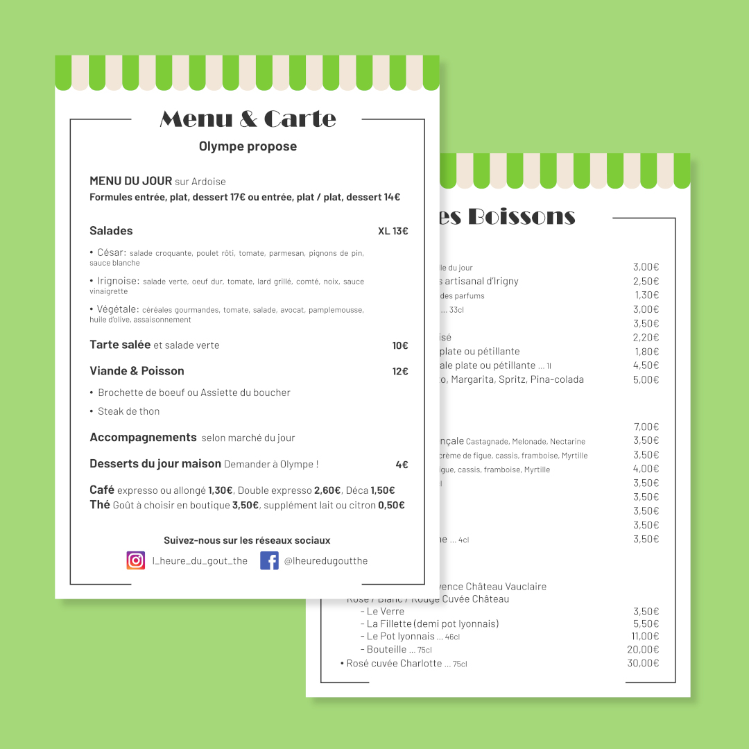 L’Heure du Goût-Thé est un salon de thé, restaurant et boutique de gourmandises. Mon travail pour Olympe et Marc consiste à réaliser l’intégralité des supports de communication et animer les réseaux sociaux. C’est un projet sur le long terme où je vais créer une nouvelle identité visuelle (flyers et cartes de visite), créer les flyers des évènements mensuels et gérer les publications sur les réseaux sociaux.