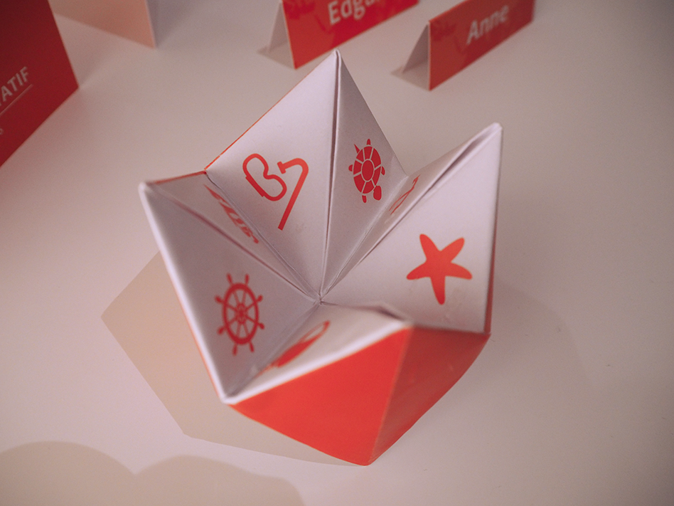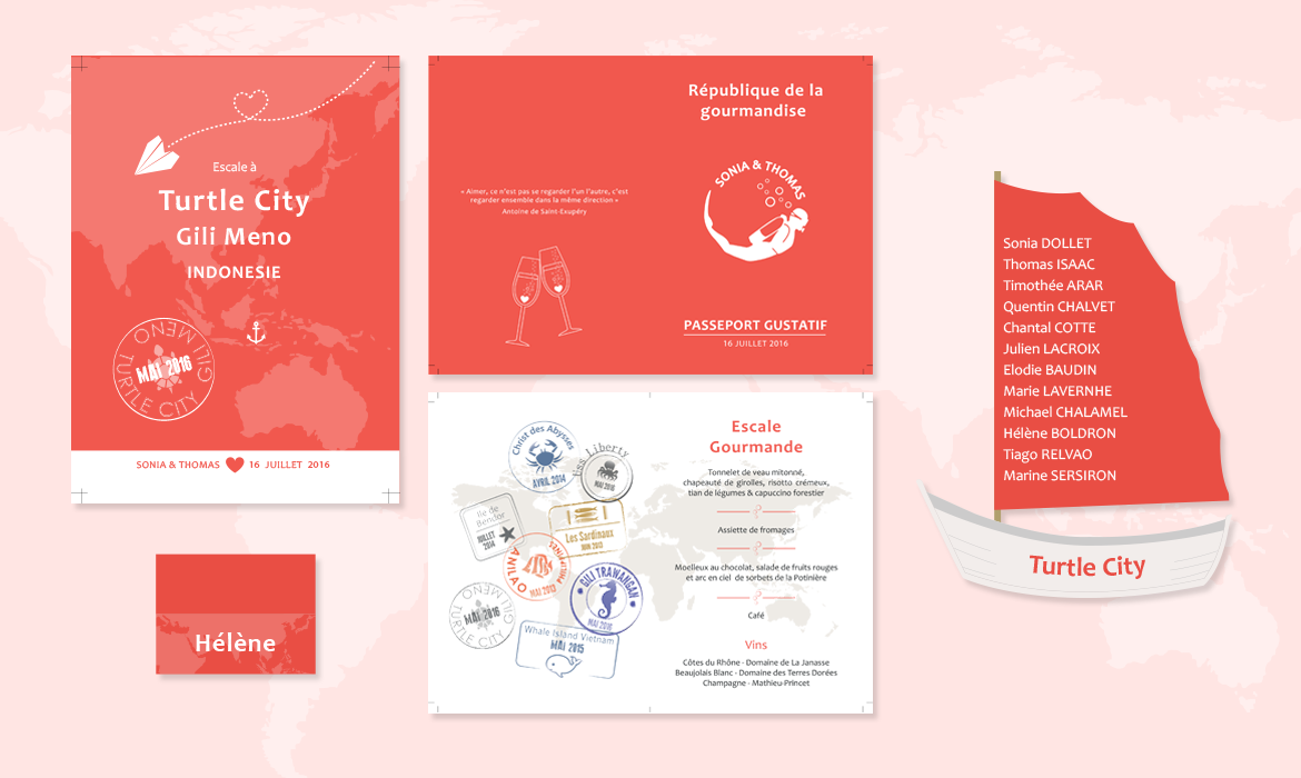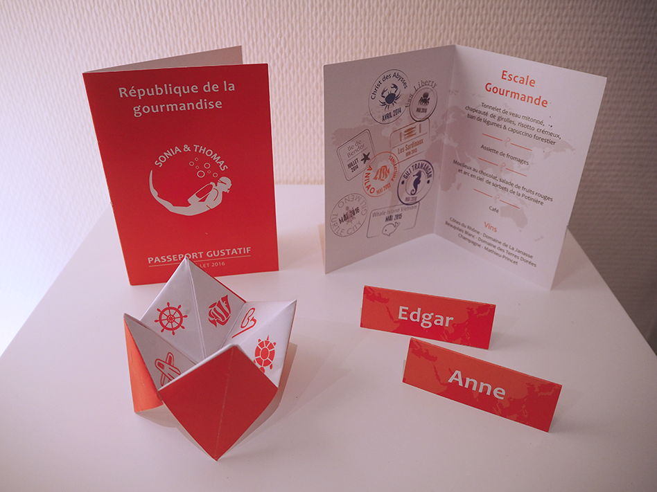 - Pour la plongée, j’ai retravaillé un logo de club de plongée existant auquel j’y ai ajouté leur prénom. Il se retrouve en écusson de passeport sur la couverture du menu. J’ai aussi créé des tampons fictifs de clubs de plongée pour l’intérieur du menu et les noms de table, et quelques pictogrammes sur le thème de la mer pour le jeu de la cocotte.