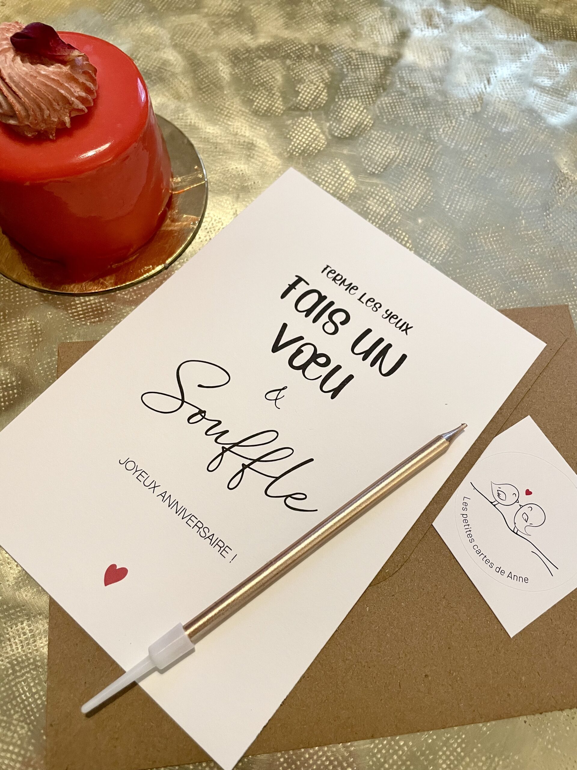 – avec une enveloppe kraft, un stickers et une bougie dorée